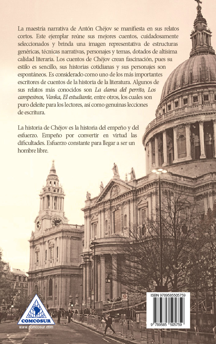 La maestría narrativa de Antón Chéjov se manifiesta en sus relatos cortos. Este ejemplar reúne sus mejores cuentos, cuidadosamente seleccionados, y brinda una imagen representativa de estructuras genéricas, técnicas narrativas, personajes y temas, dotados de altísima calidad literaria. Los cuentos de Chéjov crean fascinación, pues su estilo es sencillo, sus historias cotidianas y sus personajes son espontáneos. Es considerado como uno de los más importantes escritores de cuentos de la historia de la literatura. Algunos de sus relatos más conocidos son La dama del perrito, Los campesinos, Vanka, El estudiante, entre otros, los cuales son puro deleite para los lectores, así como genuinas lecciones de escritura.