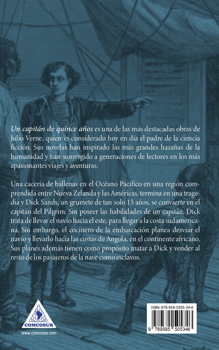 Un capitán de quince años es una de las más destacadas obras de Julio Verne, quien es considerado hoy en día el padre de la ciencia ficción. Sus novelas han inspirado las más grandes hazañas de la humanidad y han sumergido a generaciones de lectores en los más apasionantes viajes y aventuras. En la obra, una cacería de ballenas en el Océano Pacífico, en una región comprendida entre Nueva Zelanda y las Américas, termina en una tragedia. Dick Sand, un grumete de tan solo 15 años, se convierte en el capitán del Pilgrim. Sin poseer las habilidades de un capitán, Dick trata de llevar el navío hacia el este, para llegar a la costa sudamericana. Sin embargo, el cocinero de la embarcación planea desviar el navío y llevarlo hacia las costas de Angola, en el continente africano. Sus planes, además, tienen como propósito matar a Dick y vender al resto de los pasajeros de la nave como esclavos.